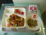 本日の給食は ミートボールのケチャップ煮・ツナと野菜のソテー・焼きじゃが・黒...
