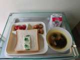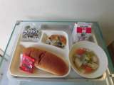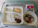 本日の給食は 鶏肉とじゃがいものスープ煮・きのこのドリア・ミニフィッシュ・コッペ...