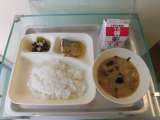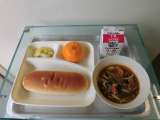 本日の給食は カレーうどん・はくさいのおひたし・みかん・おさつパン・牛乳です。 ...