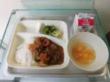 本日の給食は あげシューマイ・えびととうふのスープ・もやしとコーンのピリ辛あえ・...