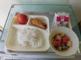 本日の給食は たらのフライ・あつあげと野菜の煮もの・りんご・ご飯・牛乳です。 ...