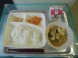本日の給食は 中華おこわ・卵スープ・キャベツのオイスターソースいため・おさつ...