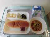 本日の給食は 豚肉と野菜のカレー煮・ほうれん草のソテー・あげポテトもち・大型コッ...