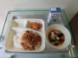 本日の給食は 鶏肉と野菜の煮もの・あつあげのしょうゆだれかけ・紅ざけそぼろ・ご飯...