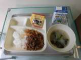 本日の給食は 豚肉のしょうが焼き・みそ汁・じゃこピーマン・ご飯・牛乳です。 「...