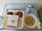 本日の給食は 煮込みハンバーグ・コーンスープ・三度豆のサラダ・食パン・牛乳です。...