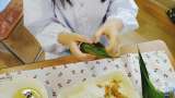 1年生がちまきを上手に笹からむいています 1枚・1枚はがしています やっとお...