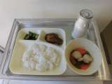 本日の給食は 鶏肉のてり焼き・じゃがいもとあつあげの煮もの・ごまかかいため・ご飯...