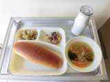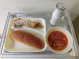 本日の給食は 一口トンカツ・ミネストローネ・アーモンドフィッシュ・ライ麦パン・牛...