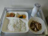 本日の給食は 鶏肉の甘辛焼き・みそ汁・キャベツの赤じそあえ・ご飯・牛乳です。 ...