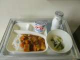 本日の給食は チキンカレーライス・キャベツと三度豆のサラダ・ヨーグルト・牛乳です...