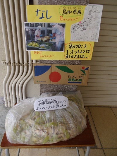 今回のカレー煮は、小麦アレルギーの子ども達に配慮し、米粉のカレールウの素で味つけしています。また、秋のくだもののなしは、子ども達が食べやすいように、給食調理員が1つ1つ包丁で芯をとり、皮をむきました。