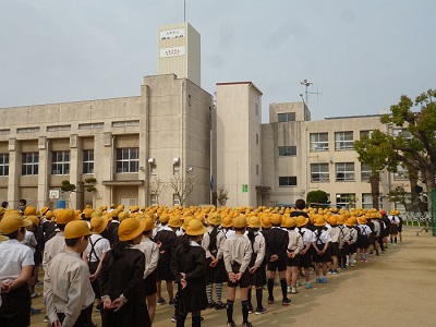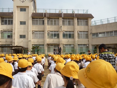 先週の全校朝会は雨天のため運動場のコンディションがよくないので、放送朝会でした。今朝が1年生にとって初めての朝会参加となりました。教えてもらった並ぶ順番に整列もでき、上級生の人たちの様子を見ながら体のむきも変えることができました。初めに歌う『校歌』を覚えていくようになり、元気よく歌える日が楽しみです。