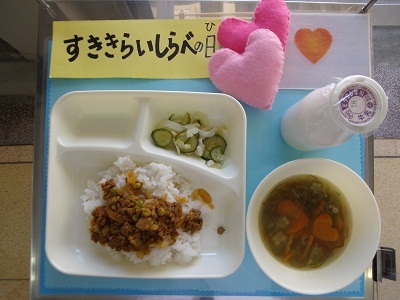献立は、タコスライス、もずくと白ねぎのスープ、グリーンサラダ、牛乳です。給食調理員が乳製品アレルギーの児童に配慮して、タコスライスは粉末チーズなしのものを作り、個別対応しました。また、スープのにんじんはハートの形で、ラッキーにんじんです。子ども達はおいしいと喜んで、楽しく食べていました。