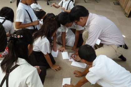4年生の外国語活動のようすです。工夫された手作り教材を使って楽しく学習していました。「My name is 〇〇〇」と答えたり、名札をつくったりしていました。先生のオリジナルジャンケンも教えてもらいました。