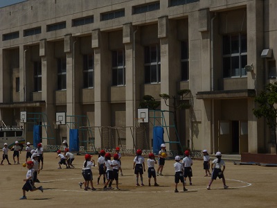 さわやかな晴天の日です。1年生全員が運動場でころがしドッジボールの学習をしました。白線の円の中で逃げる子。円の周りからボールを転がす子。どちも楽しそうな声があがっていました。