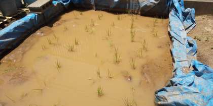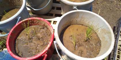 校舎西側の学習園の様子です。小さな手作りの水田で田植えを行いました。バケツでの稲の栽培も始めました。ご飯が炊けるくらいお米が収穫できるかな?楽しみです。