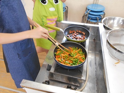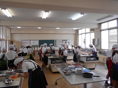 6年生が家庭科の授業で、自分が作ったエプロンを身につけて、調理実習をしました。ウインナー、にんじん、ピーマン、キャベツをていねいに切り、高温で短時間でいためました。いためると、キャベツは、かさがぐんと減ることもよく分かり、野菜をおいしく、たくさん食べることができました。