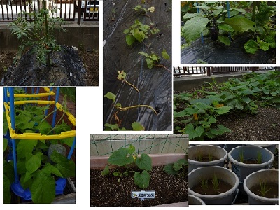 苗や種を植えてから約1か月がたちました。気温も上がりぐんぐんと成長しています。つるが伸びてきたあさがお、花が咲きだしたかぼちゃ、実ったなす、苗が大きくなってきた5年のバケツ稲など・・・。今年もなにわ伝統野菜『玉造黒門越瓜』の苗をいただき、育てています。実るのが楽しみです。