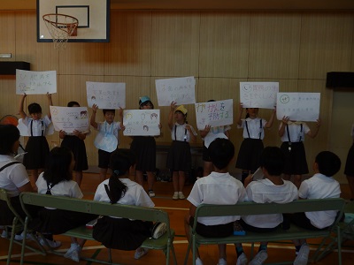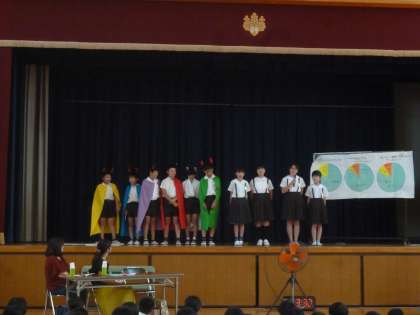 6年生の子どもたちが、『歯と口の健康』について調べ、5年生に向けて研究発表を行いました。最初に6年生の保健委員会の児童が、学校でアンケートした集計結果を分かりやすく発表しました。そして各テーマごとに工夫を凝らし、劇をしたりクイズをしたりと楽しめる発表をしていました。5年生は6年生の発表をメモを取りながら聞き、一生懸命聞いていました。 歯と口の健康について改めて学習することができた学校保健委員会となりました。