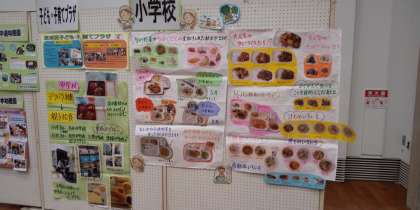 去る6月25日、東成区民センターに於いて、食育展が開催されました。小・中学校、幼稚園、保育所(園)、子ども・子育てプラザの食育活動の紹介コーナーがあり、区内小学校の栄養教諭さんによる、小学校での取り組みについて展示での紹介がありました。