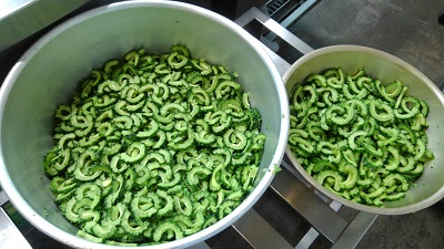 「ゴーヤチャンプルー」は、1年に1回だけ7月に給食に使用できる、ゴーヤを使った沖縄料理です。ゴーヤのワタやタネをていねいにとり、切ってから塩をかけて、苦みをやわらげる工夫をしました。大きい容器に入っているゴーヤは小学校用、小さい容器は相生中学校の3年生用です。豚肉ともやしといっしょにいためたものに、かつお節をかけて食べます。
