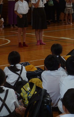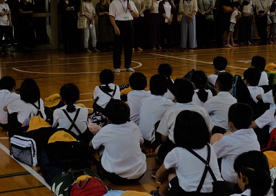 12:30 集合時刻には、みんなそろっていました。5分前集合の約束を守って、いよいよ林間学習が始まりました。「63名元気に行ってきます。」とお見送りに来てくださった保護者の皆さんに児童代表が話をしました。これから始まる初めての宿泊行事が楽しみです。