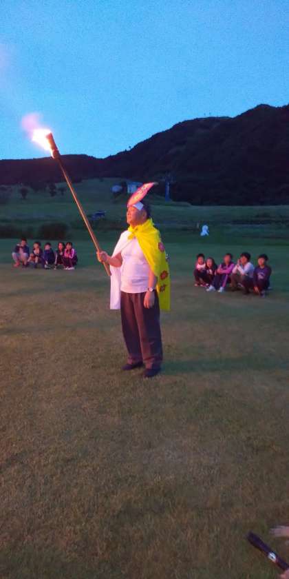 19:30 キャンプファイヤーが始まりました??今年も火の女神が登場しての点火で幕を開けました。何故か女神は校長に似ていますね(笑)