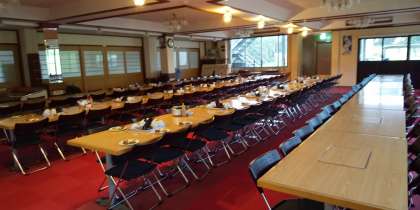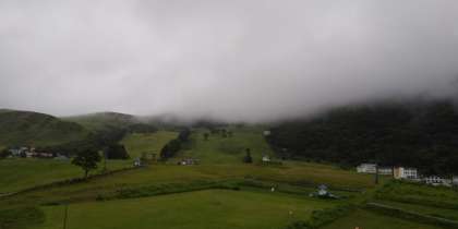 6:00 おはようございます。2日目、起床時間の6時になりました。特に問題もなく、みんなとっても良く寝て静かな朝を迎えました。外は小雨、山の頂上には雲が垂れ込めているので昨日のようには見えません。朝の集いは5階ホールでの実施になりそうです。食堂には朝ごはんの用意もできています。登山は難しいかな?