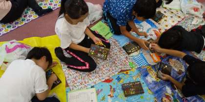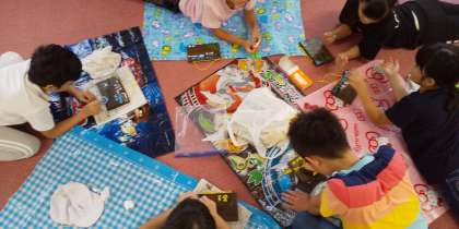 9:30 ハチ高原での林間学習、昨晩のキャンプファイヤー、山並みに掛かった雲、記念に残る絵を思い思いに描いています。