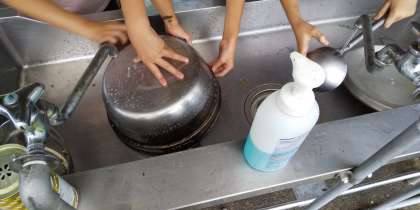 13:40 お腹がいっぱいになったら、カレー作りで使った炊事場、かまど、お鍋やまな板など、キレイに洗ったり、片付けるのも大切な学習です。