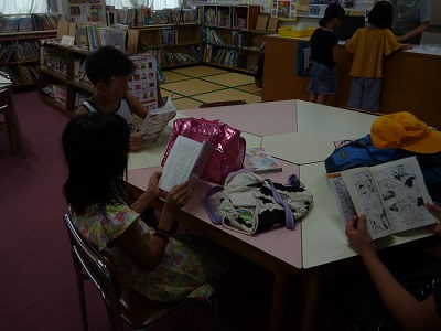 夏休みに入り、1回目の図書館開放を行いました。夏休み前に借りた3冊の本を返却・貸出しに来た子どもたち。調べ学習をしに来た子どもたち。お話会に参加しに来た子どもたち。それぞれに読書を楽しんでいました。学習室で図書ボランティアさんによる読みきかせも行い、多くの子どもたちが、物語の中に引き込まれていったようです。