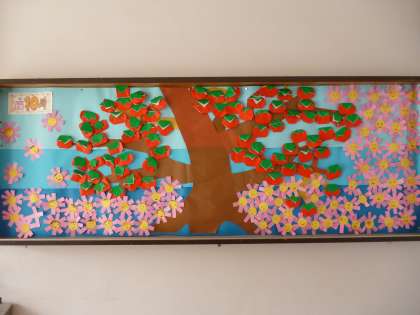10月の玄関掲示は1年生の作品です。色紙で折ったよく熟れた柿がたわわに実っています。そのまわりにコスモスが咲き乱れ、花びらの真ん中に子どもたちのかいた顔(77名全員の顔)がありより一層楽しい明るい掲示になっています。