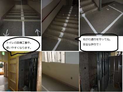 この夏休み中に、管理作業員さんが廊下・階段の左右が分かり、歩行しやすいよう中央に白線を描き直してくださいました。矢印も新たに描いてもらったので『右側通行』を守って安全に歩行ができる環境が整いました。また、廊下等の壁面もきれいに塗って落ち着いた環境にしていただきました。