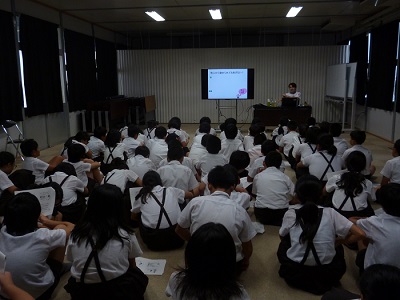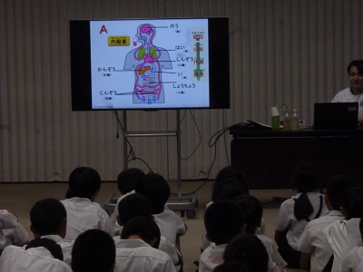 本校でお世話になっている薬剤師さんに来ていただき『薬の正しい使い方』についてお話していただきました。「薬を水以外で飲んでもいいのかな」「残っている薬を同じ症状なので、飲んでもいいのかな」「内服薬と外服薬の違いは何かな」「薬によって錠剤とカプセルがあるのはなぜかな」など、素朴な疑問に答えるように教えていただきました。治療などの目的のないものは、『他人から勧められても飲まない』と強調されていました。また、たばこの喫煙の害にも触れられていました。最後に『薬を飲むときの7つの約束』を読み上げて、今日学習したことをお家の方にも、教えてあげてほしいとおっしゃっていました。