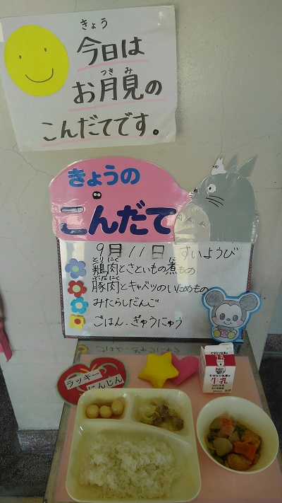 今年は9月13日(金)が十五夜です。そこで給食も、月見の献立が登場しました。さといもの煮ものやみたらしだんごが出て、子ども達は大喜びです。さらに、煮もののにんじんを、給食調理員が、月見にちなんで、うさぎの形に型抜きして入れました。「今日もおいしい。」と好評でした。