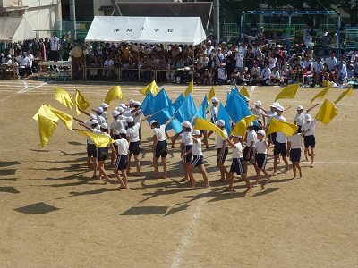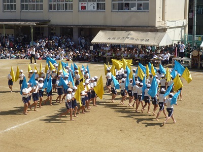 6年生の団体演技はフラッグをもって集団行動に取り組みました。青と黄色の大きな旗をはためかせて、きびきびした動きで演技しました。とてもさわやかな演技でした。