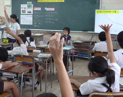 1学期から総合的な学習の一つとして稲を育てています。社会科で農業を学習をし、生産者の苦労や工夫を考えてきました。実際に育てることで米の生産者への感謝の気持ちを持つことができてきています。そこで家庭科で米の栄養素を、社会科で自分たちの食生活の中での自給率を調べることで主食としている米の良さをに気づいてきました。今回の学習は、ごはんを中心としたバランスの良い食事を自分の生活に生かすことができることをねらいとした『食育』に取り組みました。思い思いに子どもたちは、ごはんに合うメニューを楽しそうに考えていました。