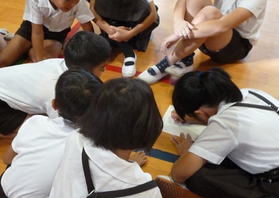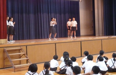 今朝の児童集会は、集会委員会主催の「ジェスチャーゲーム」でした。何かの動作をものまねしてあてるゲームです。ゲームの見本を見せた「ゴリラ」のものまねには、楽しい笑いがあり良い雰囲気でゲームが進みました。