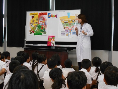 3年生が、社会科の学習で、食育インストラクターの方から、「バランスのよい食事」について学びました。1日に野菜は手をグーにした5つ分、くだものは2つ分食べるとよいことや合言葉「5ADAY」を教えてもらいました。