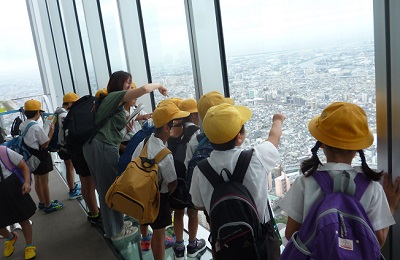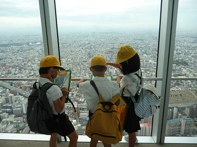 60階の展望台から大阪の様子を眺め、東西南北の様子の違いを学習しました。快晴ではなかったのですが、特徴のある建物や大阪湾、山並みなど眺めることができました。眺めの良さに感動した子どもたちでした。