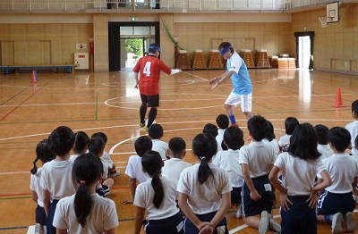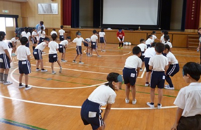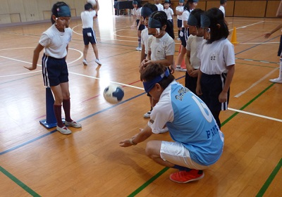 日本ブラインドサッカー協会の方々にきていただき、ブラインドサッカーを体験させていただきました。コーンの間にボールをけるとき、音を出してコーンの位置を確かめます。またボールをパスするときも言葉がけします。視覚障がい者の方と交流するときに大切なことをはじめに教えてもらいました。二人組になってアイマスクをしている人に、準備体操の動きを言葉で伝えながら自分も体操の動きをします。とても難しい様子でしたが、よい経験になったようです。パスされた音のなるボールを受けとめるのも困難さを見せていました。体験をすることで、視覚障がいに対する理解を深めることができました。