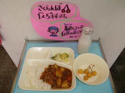 ハヤシライスは、給食調理員がルウを手作りします。小麦粉を褐色になるまで、十分いためて作ります。また、さくらんぼ(缶)は着色していない自然の色をしたものです。おいしいと好評でした。