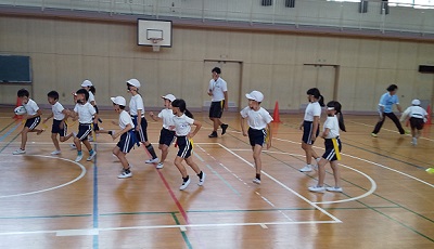 東成区の子ども体力向上事業の一貫として出前授業として講師をむかえタグラグビーの学習を行いました。子どもたちは、タグラグビーのルールを知り、楽しくゲームをしていました。