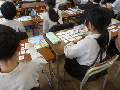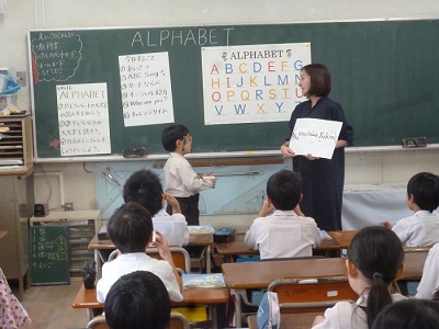 いくつかの楽しいゲームを交えながら外国語に慣れ親しみました。ABC Songを身振り手振りを使って歌いながらアルファベットを表現していました。また、自分のイニシャルをネームカードを見せながら相手に伝え合いました。授業後の振り返りカードに「初めて英語で伝えることができた。」「英語で言えるようになった。」など達成感を感じている感想がありました。