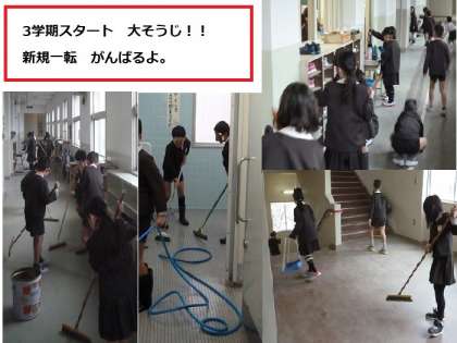 3学期が始まりました。明日からの学習に備え、みんなで大掃除をしました。教室だけでなく階段・廊下・トイレ・特別教室など隅々までていねいに掃除をしました。冷たい水でも辛抱して雑巾を洗い、拭き掃除にせいを出してがんばっていました。きれいになった環境で、明日から学習にがんばって取り組んでいきます。