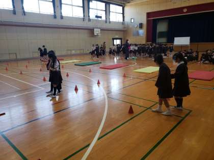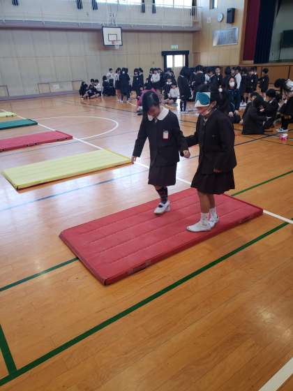 マットのだんさやジグザグみち、小さなハードルをゆっくりあるきます。
