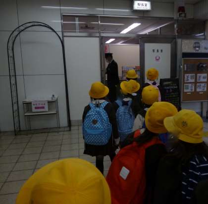 南巽駅まで駅見学に行きました。駅員さんの作った紙芝居をみたり、寝坊をしないよう工夫されたベッドなどを見学しました。事前に駅員さんに質問したいことを考えてから、その答えになる実物を見学させていただいたことで「こういうことなんだ」という気づきを持つことができました。また、普段はあたりまえに通り過ぎている駅の柱の駅名札や案内図など、地下鉄に乗る人々が少しでも満足して利用できるための工夫がいかにたくさんあるかも知ることができました。