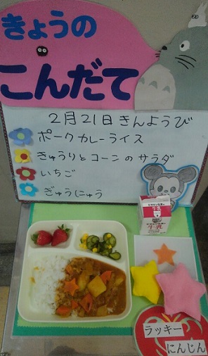 それから、カレーライスのにんじんを、給食調理員が星の形に型抜きして、全部のクラスに入れました。子ども達は「ラッキーにんじん」と言って、喜んで食べていました。