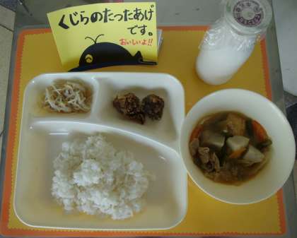 年1回のくじらを使った献立は、毎年好評です。今回はくじらをしょうが、料理酒、しょうゆで1時間以上下味をつけて、でんぷんをまぶし、油で揚げました。子ども達は、「おいしい」「おかわり」と喜んで食べていました。